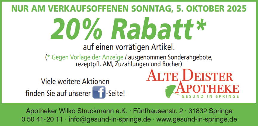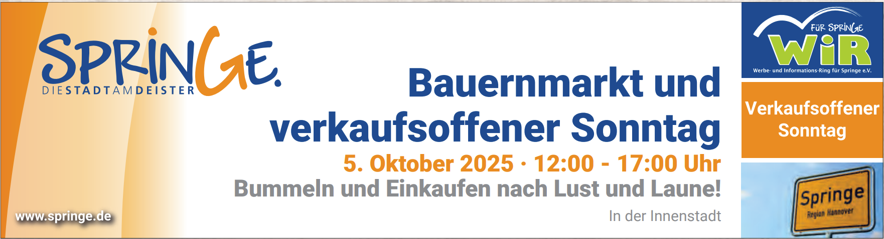Veranstaltet wird der Tag vom Werbe- und Informations-Ring für Springe. Kommen Sie vorbei, entdecken Sie Lieblingsstände und neue Ideen aus der Region – und genießen Sie einen lebendigen Sonntag am Deister.