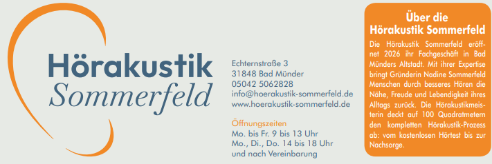 „Nah am Ohr. Nah am Menschen.“ Mit diesem Leitsatz eröffnet Nadine Sommerfeld ab Januar 2026 ihr Fachgeschäft für Hörakustik in Bad Münders Altstadt. In den Räumlichkeiten in der Echternstraße 3 deckt die Meisterin persönlich den kompletten Hörakustik-Prozess ab und bietet neben Hörsystemen unter anderem Gehörschutz- und Tinnitus-Beratung an.