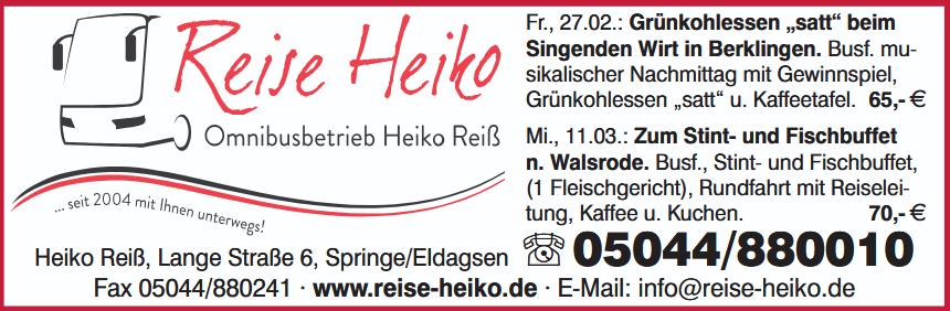 Und: Das erste Mal in der Firmengeschichte wird ein Bus getauft, hier können noch Plätze gebucht werden. Vom 17. bis 19. Februar geht es hierzu nach Templin. Bereits am 11. Februar findet bei einem gemütlichen Nachmittag im Eldagser Ratskeller ein „Reisefreundetreffen“ statt. Anmeldungen sind noch möglich. Mit Heiko Reiß freuen sich auch alle Mitarbeiterinnen und Fahrer auf ein erfolgreiches Reisejahr.