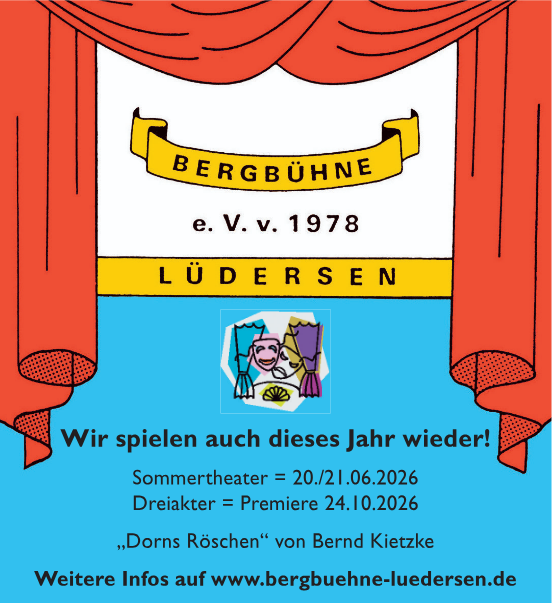 Bergbühne LÜDERSEN: Für viele beginnt Gemeinschaft, wenn auf der Bühne das Licht angeht. Mit Sommertheater, Einaktern und Sketchen bringt die Bergbühne Menschen zum Lachen – und hinter der Bühne packen Ehrenamtliche beim Bühnenbau, in der Maske oder im Fundus mit an.